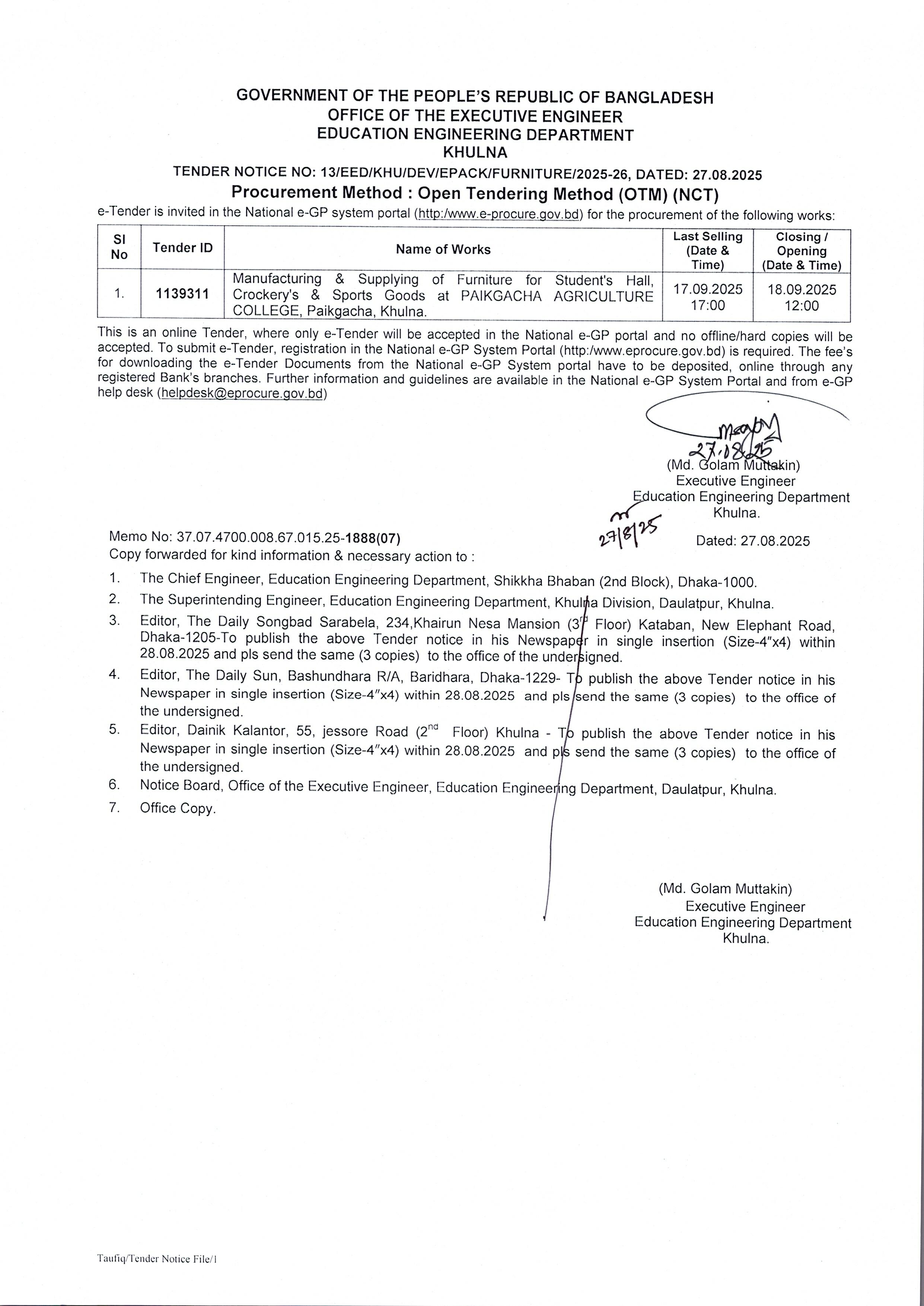 | ৫ | ১৫. টেন্ডার নোটিশ নং-১৩/২০২৫-২৬ (পাইকগাছা কৃষি কলেজ-আসবাবপত্র প্রস্তুত ও সরবরাহ) তারিখ : ২৭/০৮/২০২৫ খ্রি. | | | ২৭-০৮-২০২৫ | দেখুন |