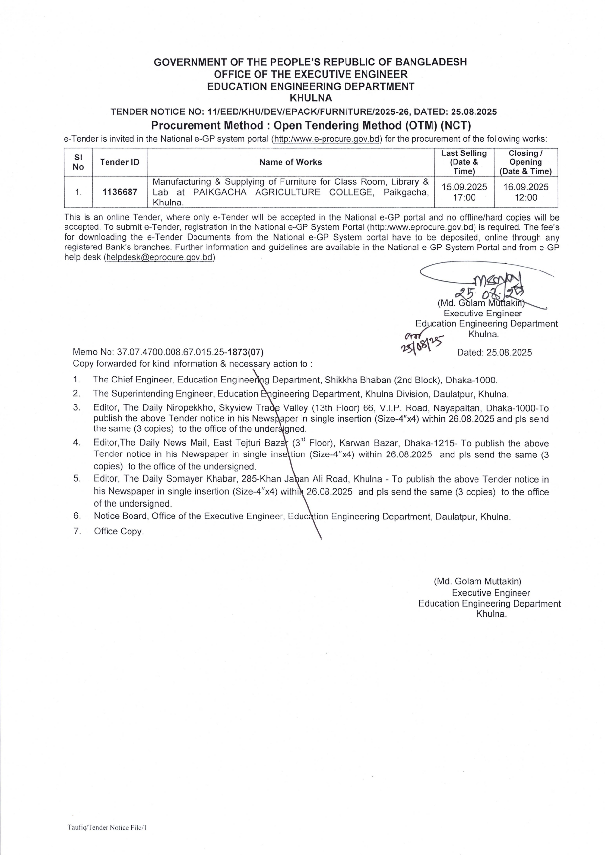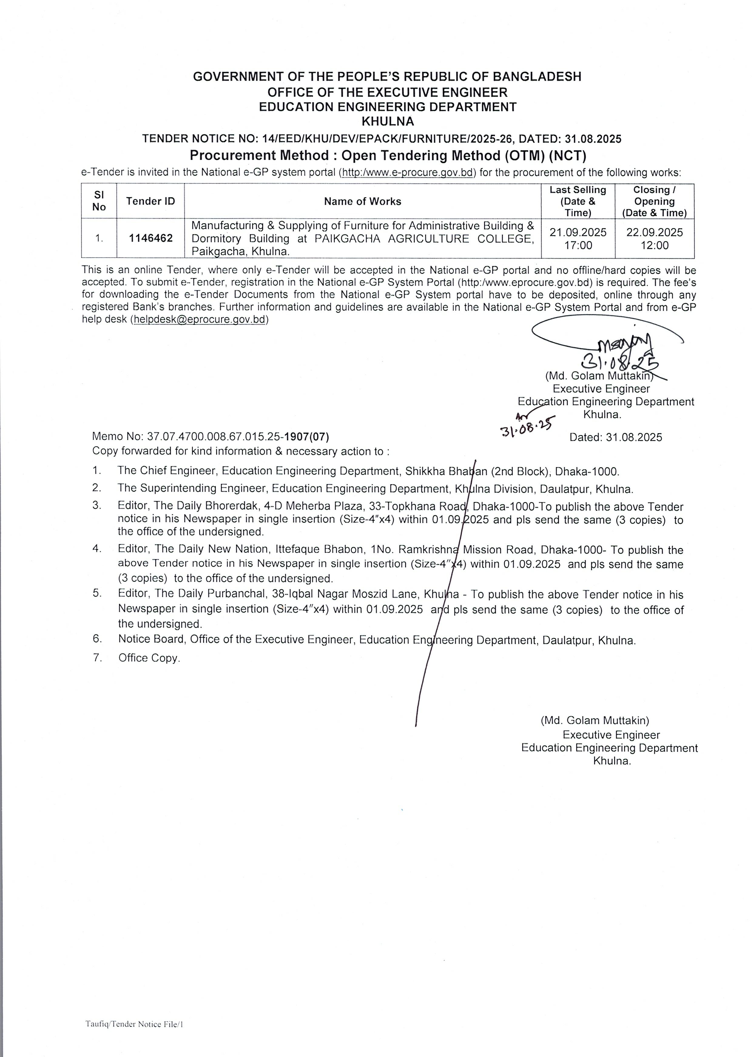 | ৪ | ১৬. টেন্ডার নোটিশ নং-১৪/২০২৫-২৬ (পাইকগাছা কৃষি কলেজ-আসবাবপত্র প্রস্তুত ও সরবরাহ) তারিখ : ৩১/০৮/২০২৫ খ্রি. | | | ৩১-০৮-২০২৫ | দেখুন |