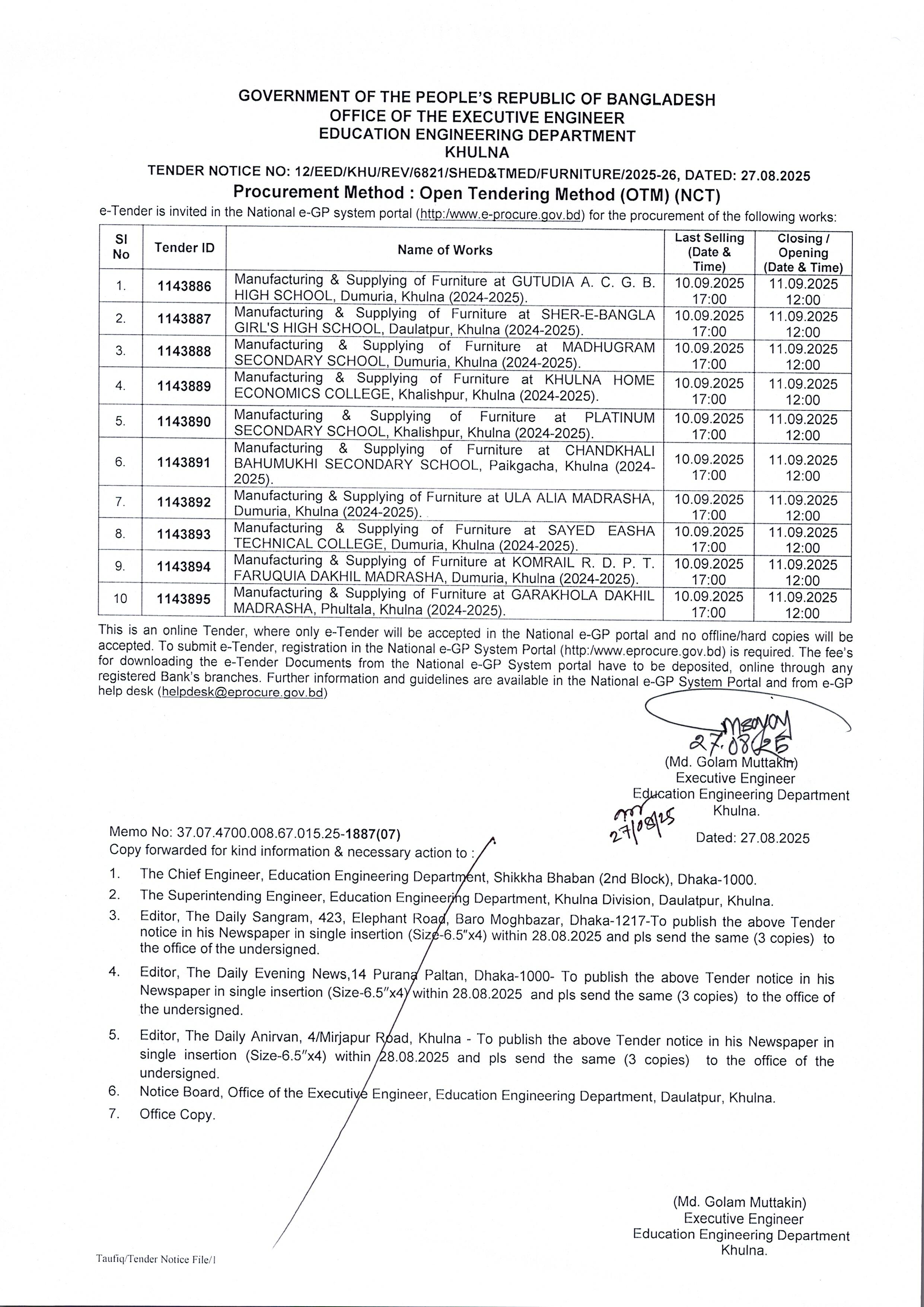 | ৬ | ১৪. টেন্ডার নোটিশ নং-১২/২০২৫-২৬ (৬৮২১-মাউশি/কারিগরি-আসবাবপত্র প্রস্তুত ও সরবরাহ) তারিখ : ২৭/০৮/২০২৫ খ্রি. | | | ২৭-০৮-২০২৫ | দেখুন |