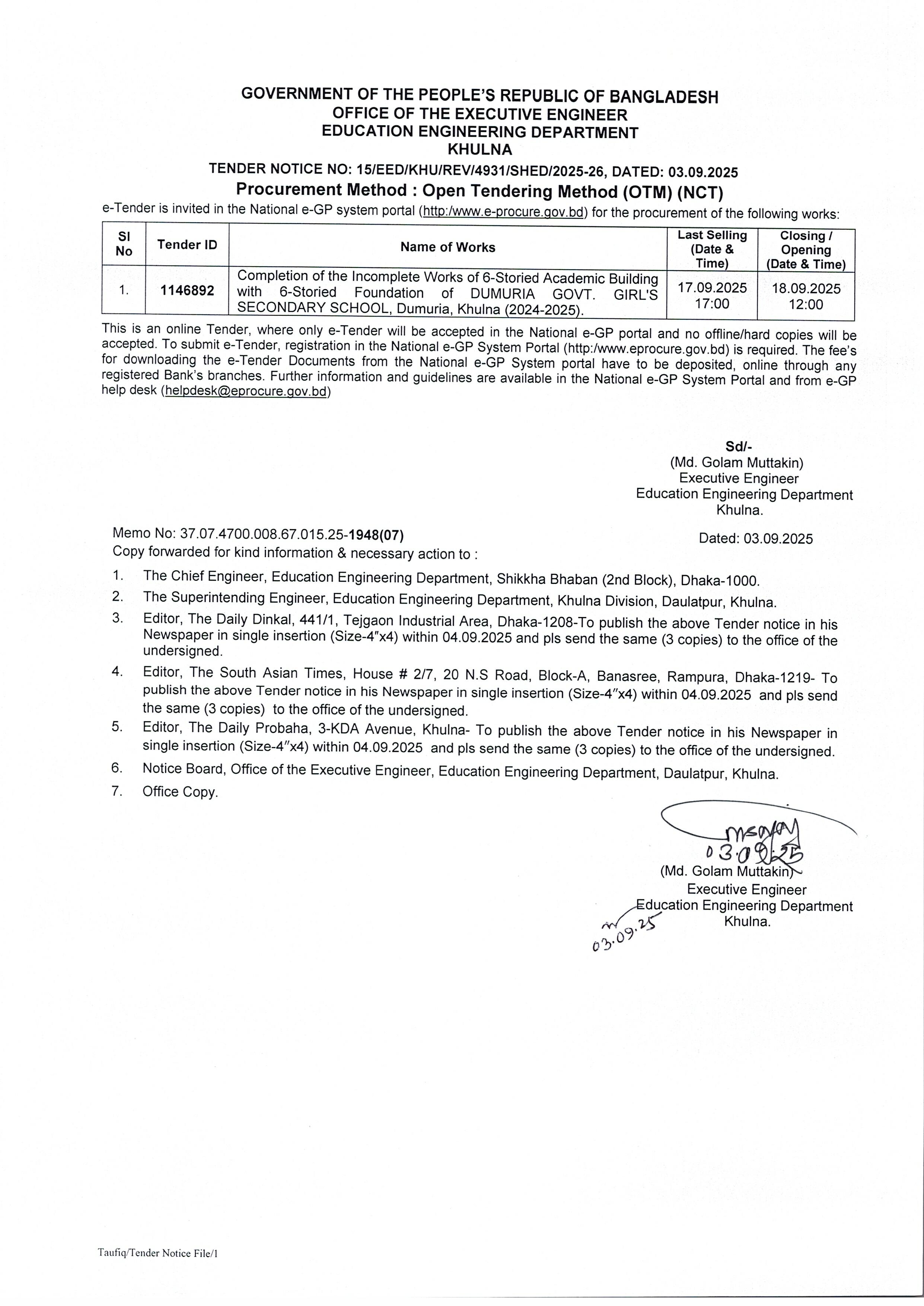 | ৩ | ১৭. টেন্ডার নোটিশ নং-১৫/২০২৫-২৬ (৪৯৩১-মাউশি) তারিখ : ০৩/০৯/২০২৫ খ্রি. | | | ০৩-০৯-২০২৫ | দেখুন |